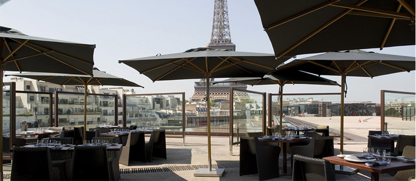 Au cœur d’un luxuriant jardin, perché sur un toit-terrasse panoramique, le restaurant Les Ombres offre une vue panoramique unique sur Paris, à l’ombre de sa voisine, la Tour Eiffel, qui projette le jour ses dentelles métalliques sur les nappes et le soir, enflamme la salle.
